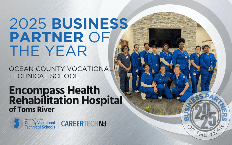 Ocean County Vocational Technical School (OCVTS) proudly recognizes Encompass Health Rehabilitation Hospital of Toms River as its 2025 Business Partner of the Year. The partnership between OCVTS and Encompass Health exemplifies the value of career and technical education by connecting classroom instruction with real-world, hands-on experiences that prepare students for success in healthcare and beyond.